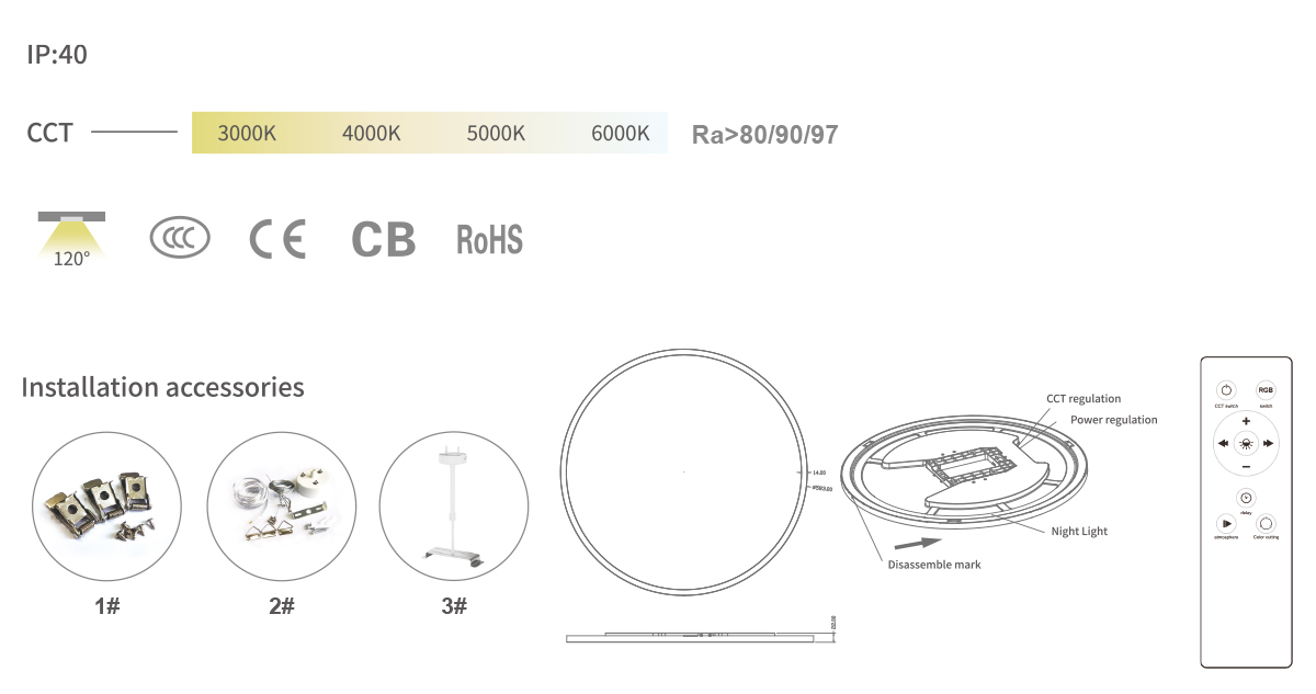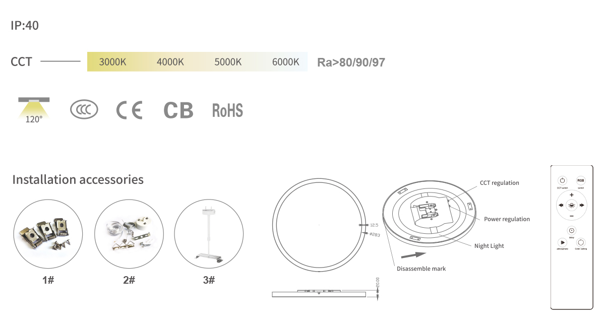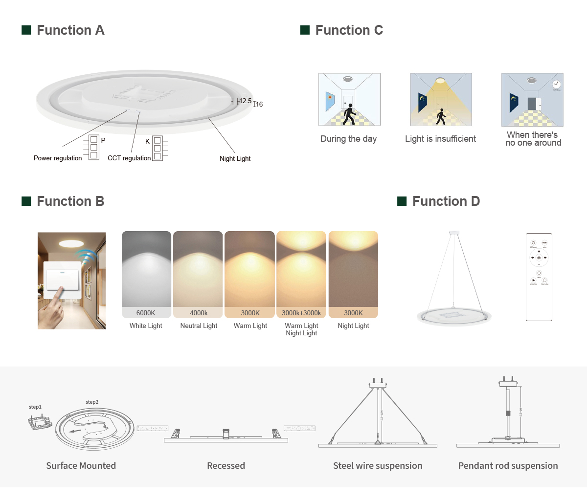 It can achieve adjustable CCT (Correlated Color Temperature) and adjustable wattage, Multiple installation methods are available, such as surface mounted, recessed and suspended. It is equipped with a flicker - free driver each light has a corresponding small night light function.