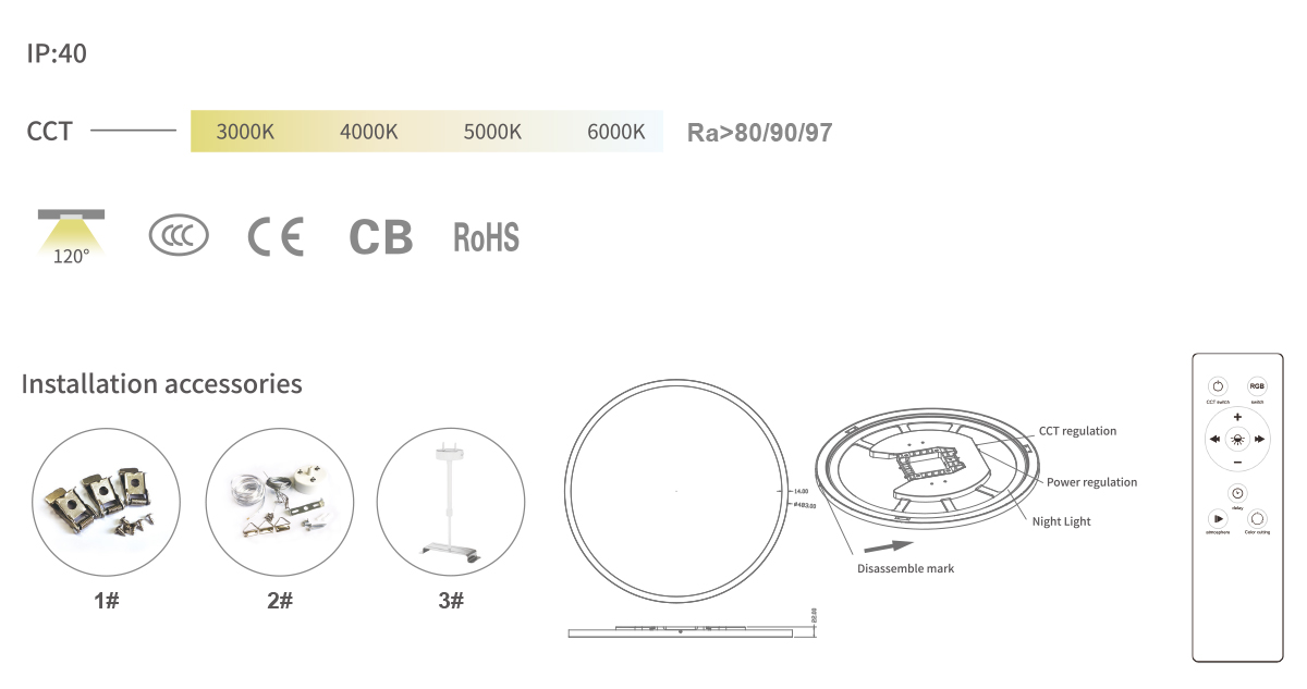 It can achieve adjustable CCT (Correlated Color Temperature) and adjustable wattage,Multiple installation methods are available, such as surface mounted, recessed and suspended. It is equipped with a flicker - free driver each light has a corresponding small night light function.