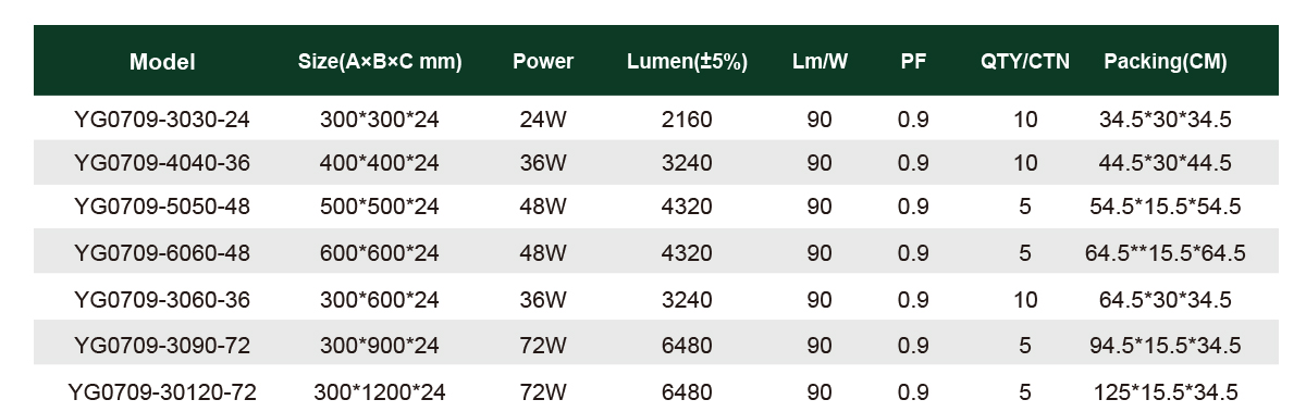 YG0709 panel light is Edge light, adopting PMMA. LGP which produces uniform light and high lumen output, good quality SMD with 100lm/W. It can fits seamlessly into any work place, surface mounted.