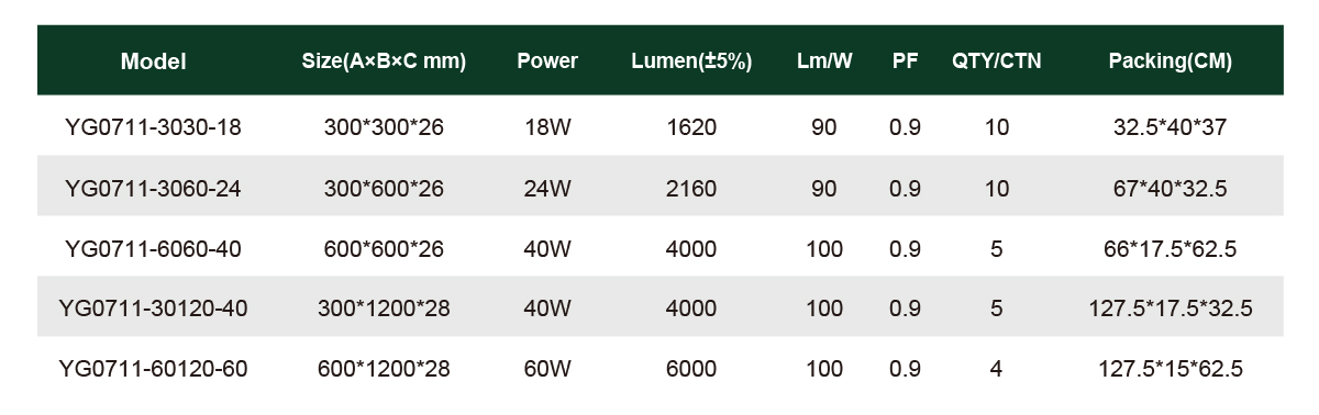 YG0711 backlit panel is ultra slim design with external isolation drive, non isolation integrated drive optional, adopts high quality SMD LED with optical lens to provide a uniform light effect, high efficiency, the absence of LGP design makes this panel more cost effective compared with normal edge-lit panel. UGR<19/22, and CCT switchable are available. Recessed /Pendant installation.