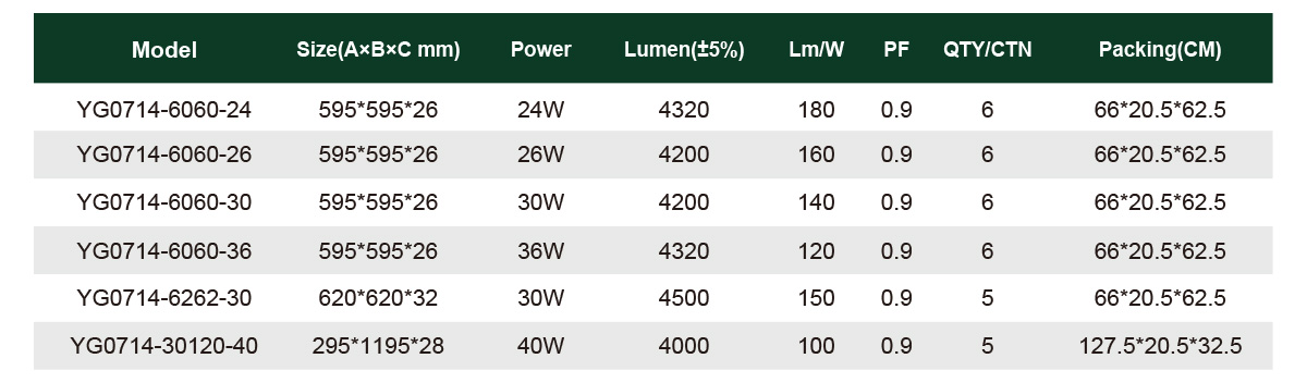 YG0714 backlit panel is ultra slim design with external isolation drive, non isolation integrated drive optional, adopts high quality , adopts high quality SMD LED with optical lens to provide a uniform light effect, high efficiency, the absence of LGP design makes this panel more cost effective compared with normal edge-lit panel. UGR<19/22, and CCT switchable are available. Recessed / Pendant installation.